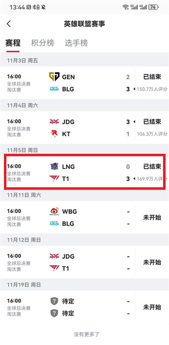 3、在詳細(xì)的賽程列表中,用戶(hù)可以找到自己想要看的選手評(píng)分的隊(duì)伍,如果賽程中有這個(gè)隊(duì)伍的比賽記錄,就可以點(diǎn)擊記錄進(jìn)入到比賽詳情界面;