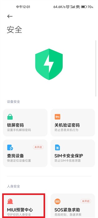 2、在安全界面中可以看到【MIUI預(yù)警中心】點(diǎn)擊進(jìn)入到對應(yīng)界面中