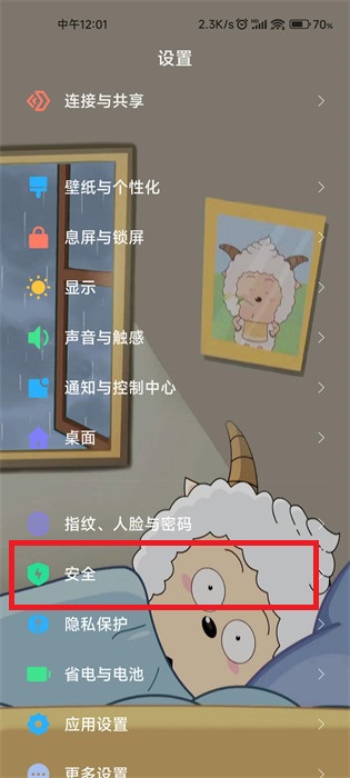 1、打開我們的小米手機(jī)進(jìn)入到設(shè)置功能界面,在設(shè)置界面中下滑找到【安全】功能,進(jìn)入到其界面;