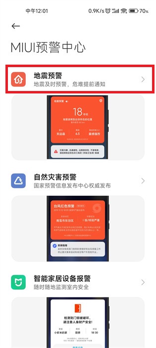 3、在此功能界面中,我們可以看到【地震預(yù)警】功能,需要進(jìn)入其中去進(jìn)行開啟操作;