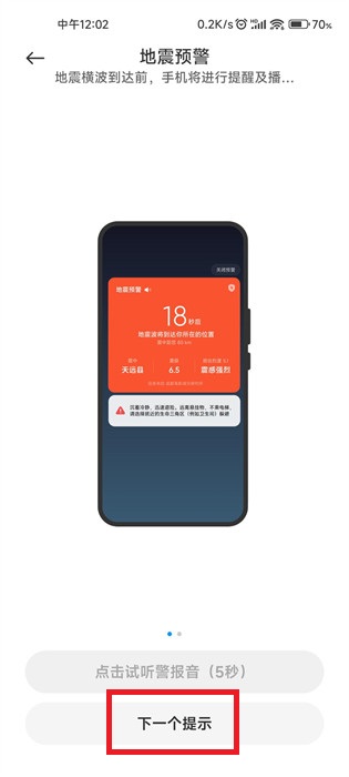 6、在預(yù)警打開的過程中,需要試聽一下警報,然后才能點(diǎn)擊下方的【下一個提示】進(jìn)行下一步;