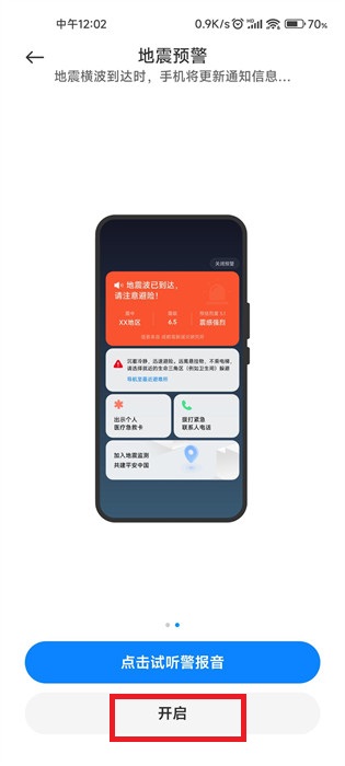 7、在試聽警報聲之后,我們就可以點(diǎn)擊【開啟】打開地震預(yù)警功能。