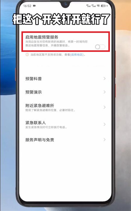 5、在地震預(yù)警功能中只需要【打開按鈕】,同意授權(quán)然后按照步驟的提示即可完成打開教程。