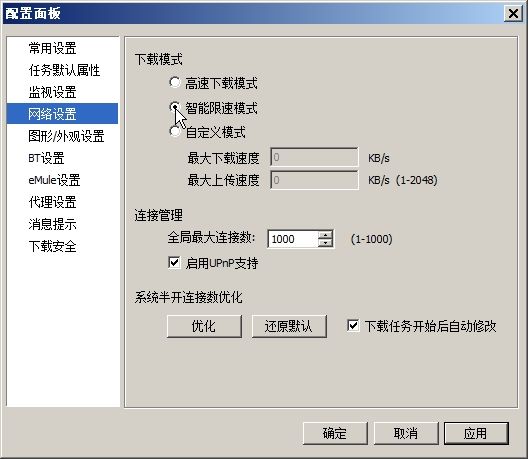 問題解決:在迅雷下載時(shí)請(qǐng)選擇“工具”→“配置”命令,再單擊“網(wǎng)絡(luò)設(shè)置”標(biāo)簽,然后選擇“下載模式”下的“智能限速模式”(如圖3)。這是迅雷網(wǎng)絡(luò)公司下載核心的同事們花費(fèi)了大量時(shí)間開發(fā)并不斷改進(jìn)智能限速模塊,設(shè)置了多種判斷邏輯,對(duì)用戶當(dāng)前的網(wǎng)絡(luò)狀態(tài),環(huán)境進(jìn)行判斷,并得出限制方案。此功能推出后,確實(shí)解決了不少問題。雖然有些情況下還有問題,但是優(yōu)化仍在繼續(xù)進(jìn)行。