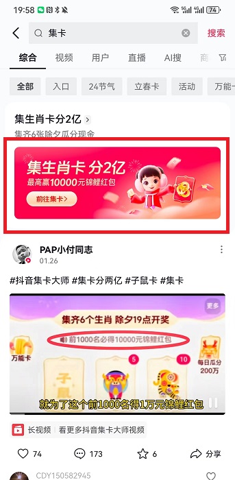 1、在抖音中搜索【集卡分兩億】然后去進行搜索,在搜索結果中點擊下方的活動,進入到活動界面中;