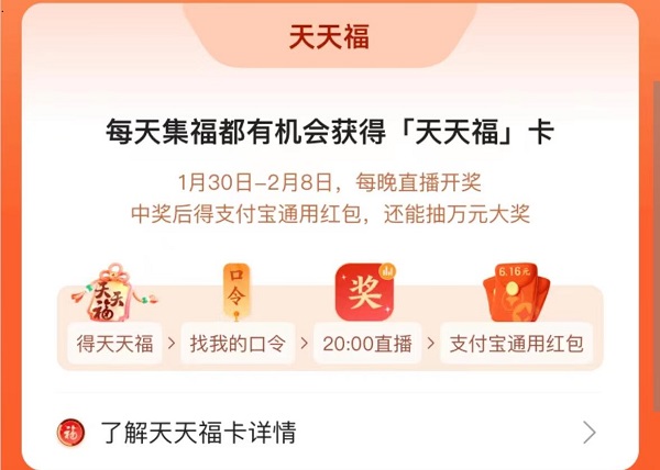 1、天天??ǎ?/strong>除了集五福瓜分獎金之外,還有其他的活動也可以參與獲得獎勵,比如天天??ㄩ_獎,有機會獲得萬元大獎,還有各種支付寶通用紅包,在使用支付寶付錢的時候就可以直接抵扣,十分方便。