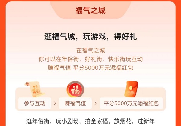 4、福氣之城:在這里你可以在年俗街、好禮街、快樂街上去進行互動,賺取各種福氣值,也可以參與到平分5000萬的添福紅包。