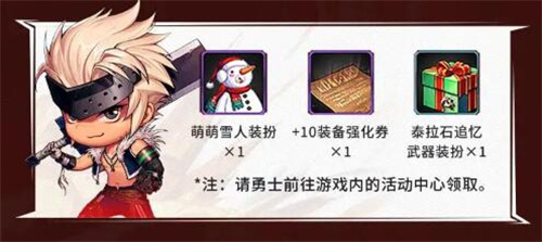 萌萌雪人裝扮x1、+10裝備強(qiáng)化券、泰拉石追憶武器裝扮x1