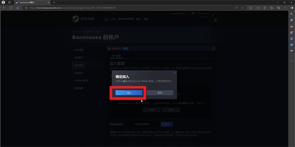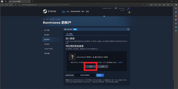 9、隨即會(huì)彈出一個(gè)小的確定框,點(diǎn)擊【邀請(qǐng)】就可以完成家庭創(chuàng)建者視角,等待好友同意即可加入;