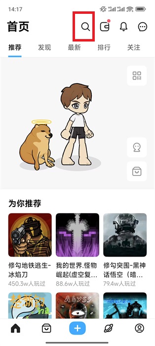 1、下載創(chuàng)游世界,然后在創(chuàng)游世界軟件中點(diǎn)擊上方的【放大鏡】去進(jìn)行搜索;