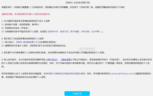 2、想要參與測試服的旅行者可點擊上分【問卷地址】按鈕填寫招募問卷,通過玩家?guī)煺心嫉穆眯姓?,將有機會獲得后續(xù)小規(guī)模封閉測試資格(安卓、i0S及PC設(shè)備玩家均可參與填寫);