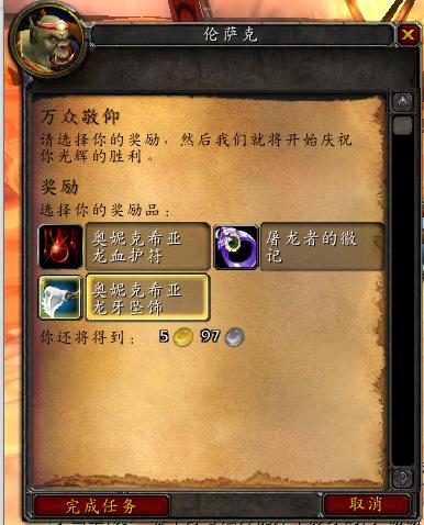 你完成了一個(gè)幾乎不可能完成的任務(wù)。黑龍公主已經(jīng)被你斬殺。拿下她的頭顱,把它交給暴風(fēng)城的瓦里安烏瑞恩國王。