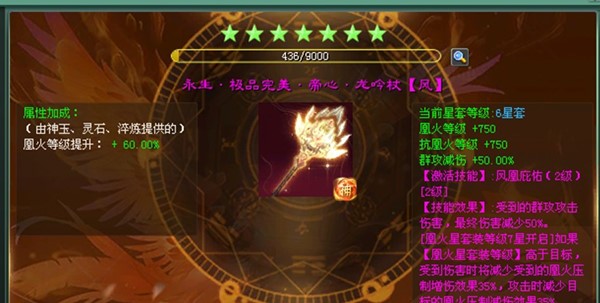 其能百分比提升裝備上由凰火神玉、凰火靈石和凰火淬煉提供的凰火等級與抗凰火等級,最高達(dá)500%,凰火星具有星級套裝效果,隨著套裝等級提高,凰火/抗凰火等級加成,以及群攻減傷百分比會隨著提高,且如果凰火星套裝達(dá)到7星套以上,且套裝等級高于目標(biāo)時,將可以使玩家在被凰火壓制時削弱此壓制效果含凰火等級和抗凰火等級的壓制,其主要來源為區(qū)戰(zhàn)商店盲盒免費獲取和商會特惠必買。