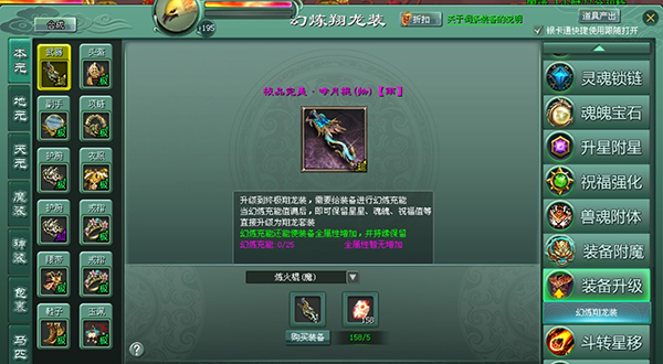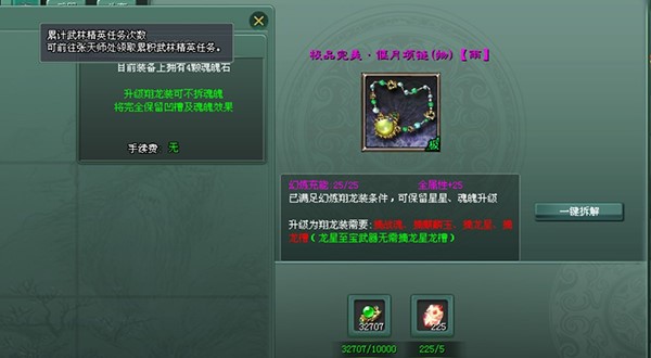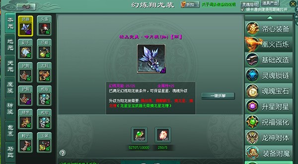 2、裝備進(jìn)行翔龍裝煉化時,玩家需要先拆解升級裝備的戰(zhàn)魂,麒麟玉、龍星、龍槽,可通過一鍵拆解完成。