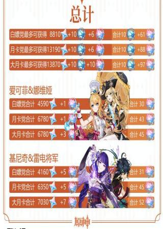 統(tǒng)計(jì)范圍從新版本更新開始,以版本持續(xù)42天進(jìn)行計(jì)算,愛可菲和娜維婭池,基尼奇和雷電將軍池情況也分別進(jìn)行了統(tǒng)計(jì),月卡紀(jì)行作為一個(gè)可選項(xiàng)列在表中
