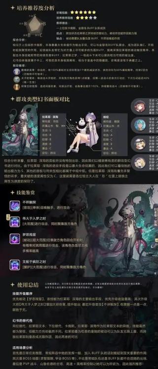 1、拉萊耶深海自身技能特點鮮明。其普攻不詳觸探能對敵方單體造成基于自身最大生命14%的傷害,并附加拉萊耶之夢,回合開始時造成持續(xù)間接傷害。大招偉大于入夢之時可將大范圍內敵方角色聚集,造成最大生命16%的傷害并附加拉萊耶之夢,這使得她在聚怪方面有突出表現,陣容搭配需圍繞其聚怪能力展開。