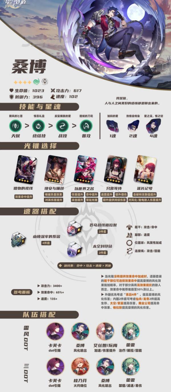 4、遺器選晨昏交界的翔鷹四件套,提供風(fēng)屬性加傷且讓行動(dòng)條提前百分之二十五,可增加桑博持續(xù)負(fù)面?zhèn)凸舣B加頻率。幽鎖深牢的系囚能讓其無視百分之六防御,隊(duì)伍有其他減防角色時(shí)收益更高。