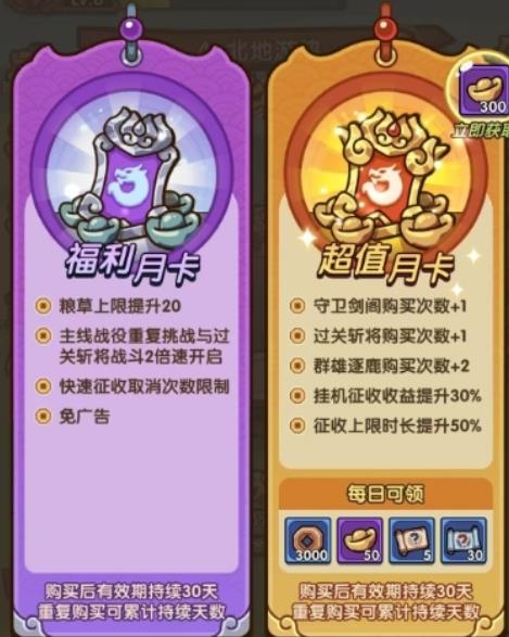 3、月卡有兩檔,購買后每日領(lǐng)取的道具獎勵不同。玩家可依據(jù)期望的游戲體驗,挑選符合自己需求的月卡檔位。