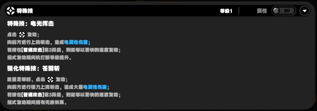 特殊技-電光斬:點(diǎn)擊特殊攻擊鍵發(fā)動(dòng),向前方進(jìn)行上挑斬?fù)粼斐呻妼傩詡Γ艚釉谄胀ü舻?段或者普通攻擊-落雷后,則能夠以更快的速度發(fā)動(dòng),招式發(fā)動(dòng)期間抗打斷等級(jí)提升。
