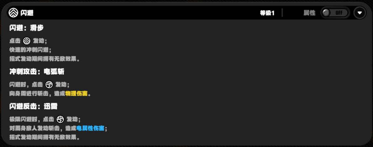 閃避反擊-迅雷:極限閃避時(shí),點(diǎn)擊普攻鍵發(fā)動(dòng),對(duì)身周敵人發(fā)動(dòng)斬?fù)?,造成電屬性傷害,招式發(fā)動(dòng)期間擁有無(wú)敵效果。