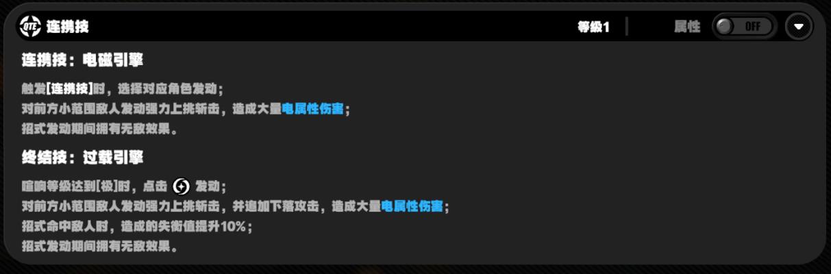 連攜技-電磁引擎:觸發(fā)連攜攻擊時(shí),點(diǎn)擊角色頭像發(fā)動(dòng),對(duì)前方小范圍敵人發(fā)動(dòng)強(qiáng)力上挑斬?fù)簦斐纱罅侩妼傩詡?,招式發(fā)動(dòng)期間擁有無(wú)敵效果。