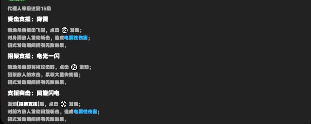 支援突擊-回旋閃電:發(fā)動(dòng)招架支援后,點(diǎn)按普攻鍵發(fā)動(dòng),對(duì)前方敵人發(fā)動(dòng)回旋斬?fù)?,造成電屬性傷害,招式發(fā)動(dòng)期間擁有無(wú)敵效果。