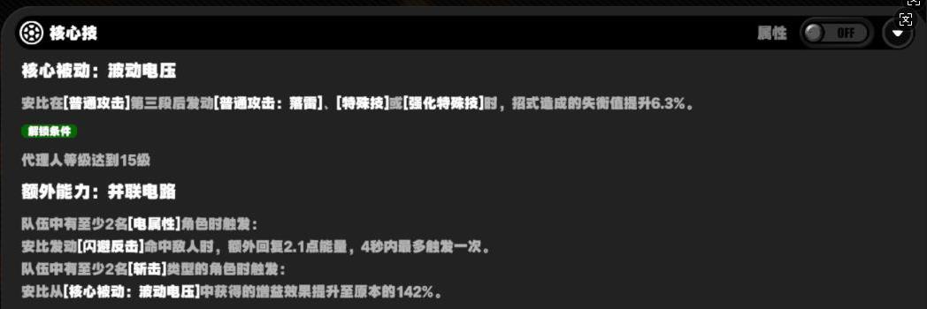 并聯(lián)電路:隊(duì)伍中存在與自身屬性或陣營(yíng)相同的角色時(shí)觸發(fā),安比發(fā)動(dòng)閃避反擊命中敵人時(shí),額外回復(fù)72點(diǎn)能量,5秒內(nèi)最多多觸發(fā)一次。