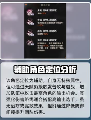 2、輔助定位精準(zhǔn),憑借獨(dú)特的增傷手段和對(duì)敵方的減益效果,能有效提升團(tuán)隊(duì)整體戰(zhàn)斗力,與各類輸出角色搭配都能產(chǎn)生良好的化學(xué)反應(yīng)。