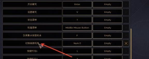 3、在控制選項(xiàng)里找到切換肩膀視角功能默認(rèn)按鍵可能不符合操作習(xí)慣將其修改為數(shù)字0鍵方便后續(xù)快速切換實(shí)現(xiàn)角色位置的調(diào)整。