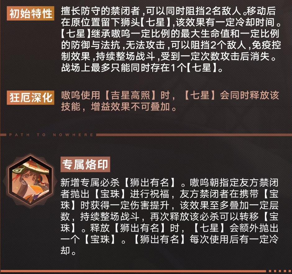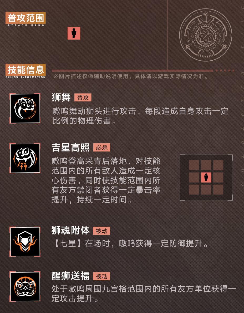2、技能戰(zhàn)斗作用上獅魂庇佑可發(fā)揮醒獅威嚴嚇退敵人為己方創(chuàng)造有利戰(zhàn)斗局面在對抗中爭取優(yōu)勢營造安全環(huán)境。