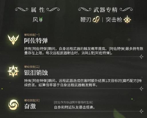 3、被動(dòng)技能使持有阿佐特彈時(shí)遠(yuǎn)程武器觸發(fā)概率提升攻擊可額外結(jié)算敵人腐朽配方的持續(xù)傷害協(xié)戰(zhàn)登場(chǎng)時(shí)還能提升自身和附近隊(duì)友暴擊率增強(qiáng)隊(duì)伍爆發(fā)能力。