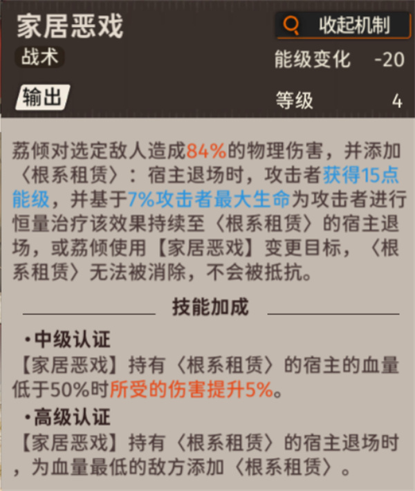 1、戰(zhàn)術(shù)技能家居惡戲是核心輔助技能,可施加根系租賃效果為隊友治療,進階后能增傷并自動轉(zhuǎn)移效果,高級認證后可常駐場內(nèi)提供穩(wěn)定增益,因此加點優(yōu)先級最高需加滿至6級。