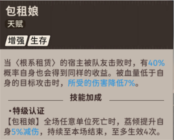 2、天賦技能包租娘能增強防御能力,全滿時可獲得27%減傷效果,在面對強力敵人時大幅提升生存能力,為保證戰(zhàn)斗續(xù)航應(yīng)優(yōu)先將該技能加滿。