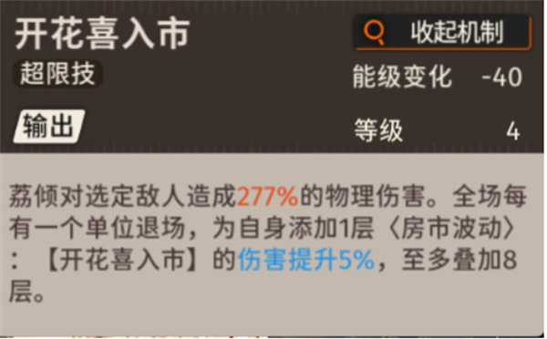 3、超限技能開花喜入市雖為單體攻擊且基礎(chǔ)倍率較高,加滿后有增傷效果,但因角色基礎(chǔ)攻擊較低,綜合考慮輸出性價比優(yōu)先加到4級即可滿足戰(zhàn)斗需求。
