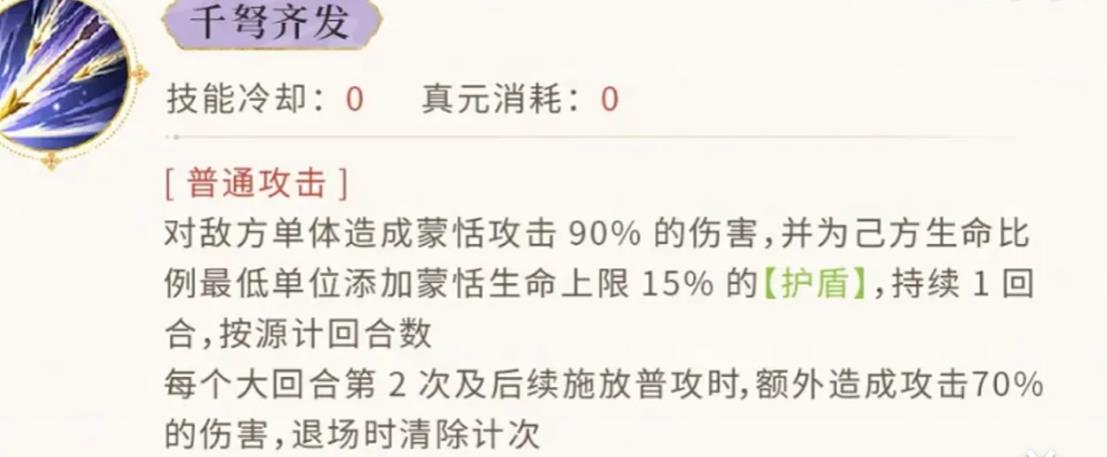 1、普攻對(duì)敵人造成90%傷害并為生命比例最低隊(duì)友添加一回合護(hù)盾每個(gè)大回合第二次及后續(xù)普攻額外造成70%傷害提升輸出效率。