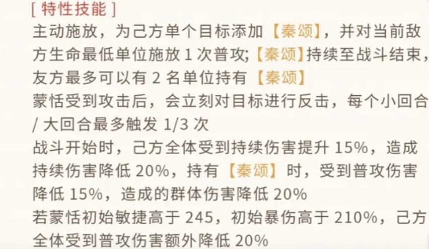 2、特性技在遭受攻擊時(shí)反擊目標(biāo)戰(zhàn)斗開始改變我方持續(xù)傷害狀態(tài)持有秦頌可降低受到的普攻傷害主動(dòng)使用能為隊(duì)友添加秦頌并普攻生命最低敵人。