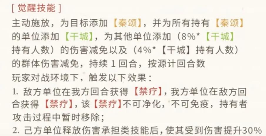 3、覺(jué)醒技萬(wàn)里長(zhǎng)城主動(dòng)使用為目標(biāo)添加秦頌為持有者加干城其他單位獲傷害減免被動(dòng)使敵我雙方回合均獲禁療限制回復(fù)能力。