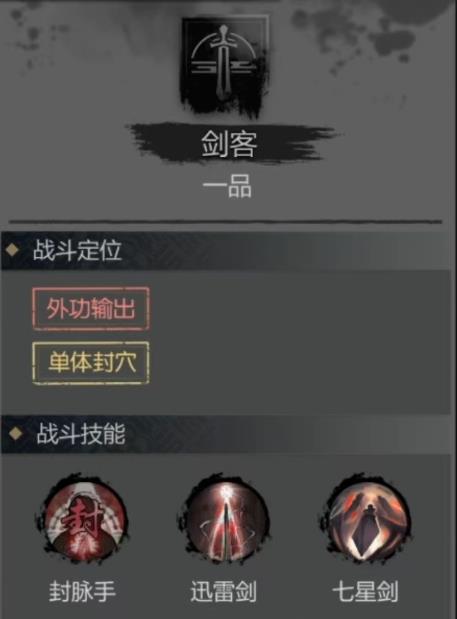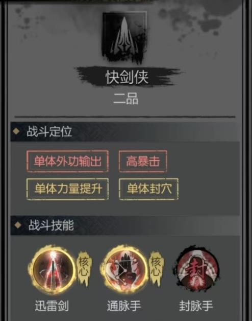 4、快劍俠核心技能包括迅雷劍通脈手封脈手定位為單體外功輸出擁有高暴擊單體封穴單體力量提升等效果適合針對單個強敵展開攻擊。
