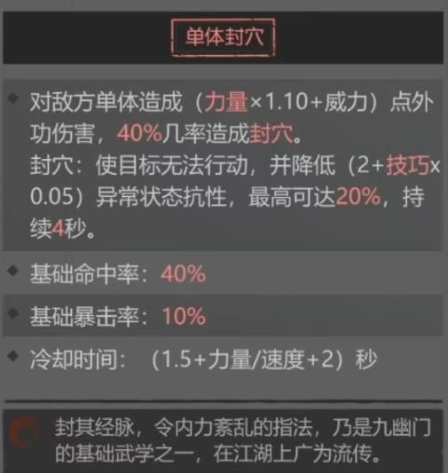 1、戰(zhàn)斗定位為外功輸出具備單體封穴能力主要技能有封脈手、迅雷劍和七星劍封脈手可造成外功傷害與封穴效果并降低目標異常抵抗能力其威力和冷卻受力量速度影響。