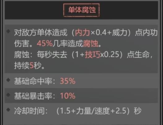 2、腐蝕丹可對敵方單體造成內功傷害,45%幾率觸發(fā)腐蝕,使目標每秒掉血持續(xù)5秒,威力與內力相關,削弱敵方生存能力。