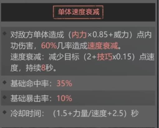 3、寒霜丹對敵方單體造成內功傷害,60%幾率造成速度衰減,降低值與技巧有關,能打亂敵方戰(zhàn)斗節(jié)奏,為己方創(chuàng)造優(yōu)勢。