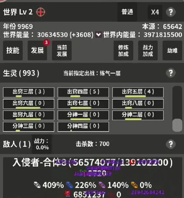 3、出戰(zhàn)配置選擇低級單位即可,戰(zhàn)斗主要依賴毒傷輸出,待世界能量穩(wěn)定后逐步增加人口數(shù)量或百分比數(shù)值,同時適當(dāng)提升壽命數(shù)值維持整體進(jìn)程穩(wěn)定。