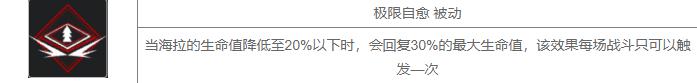 4、極限自愈也是被動技能,當海拉生命值降到20%以下,可回復30%最大生命值,每場戰(zhàn)斗只能觸發(fā)一次,升級能提高回復比例。