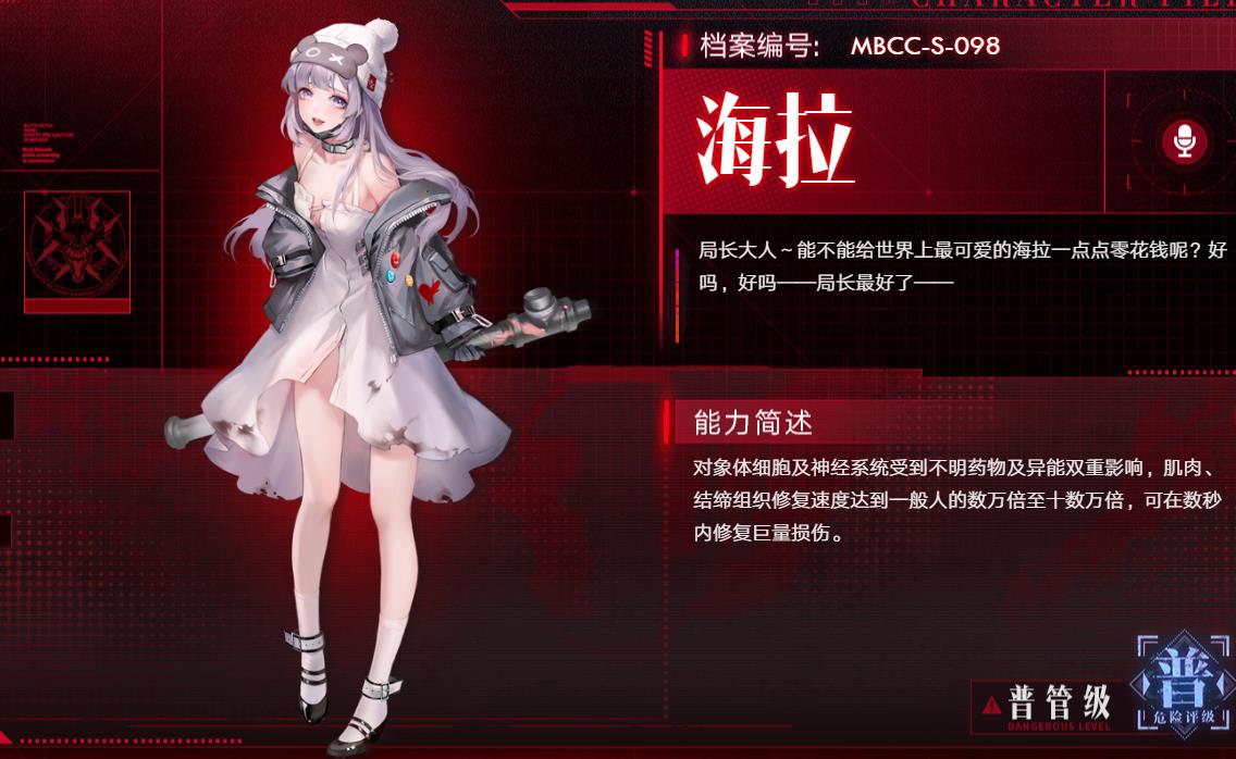 無期迷途里海拉是辛迪加的貧民少女,7歲時父母因走私被同伙槍殺,她淪為孤兒后在辛迪加流浪,靠盜竊詐騙等為生還曾加入黑道幫派但都不長久,后來海拉被朋友賣給帕爾馬實驗室做人體實驗,在那里她覺醒了自愈能力她與同被囚禁的九十九建立了友誼,二人一起逃離實驗室并懲治了研究員,重回辛迪加后海拉在一次黑幫火并中失利與九十九失散隨后被捕并被轉移,遭入侵引發(fā)的暴亂中,她試圖逃走但失敗后來在與局長的相處中逐漸轉變態(tài)度。