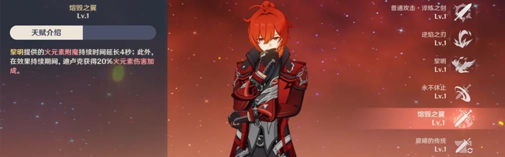熔毀之翼:黎明提供的火元素附魔持續(xù)時(shí)間延長(zhǎng)4秒,此外在效果持續(xù)期間,迪盧克獲得20%火元素傷害加成