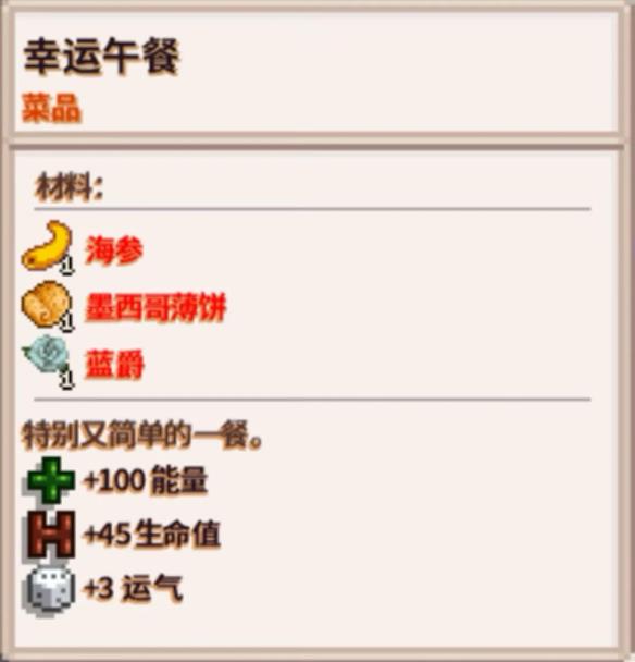 4、幸運午餐也是不錯的暫時提升選擇,由海參玉米餅藍爵士制作而成,食用后可增加3點運氣并持續(xù)11分鐘11秒效果較為顯著。