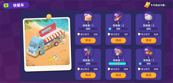 4、重復(fù)刷餐車同一調(diào)料可提升熟練度升級(jí)后一次能獲4原料搭配外賣使用餐車專注刷熟練度低的調(diào)料其余從外賣禮包選擇性價(jià)比更高。