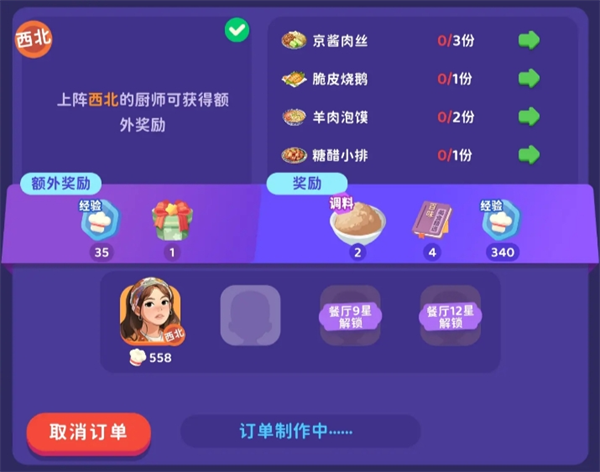 2、外賣是重要獲取方式每天可帶回24個(gè)調(diào)料且外賣訂單額外獎(jiǎng)勵(lì)能帶回調(diào)料禮包若訂單與廚師不符可拒絕5分鐘后刷新。