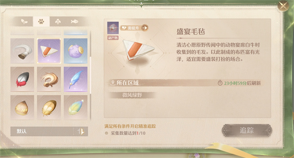 3、宴席白牛棲息地材料24小時刷新一次玩家可在地圖左下角材料界面查看冷卻時間合理安排時間前往收集。