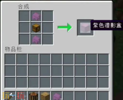 2、獲取潛影殼后在工作臺將其與箱子合成潛影箱,得到原始潛影箱后,再用骨粉與潛影箱合成,這樣就能得到可染色的白色潛影箱。